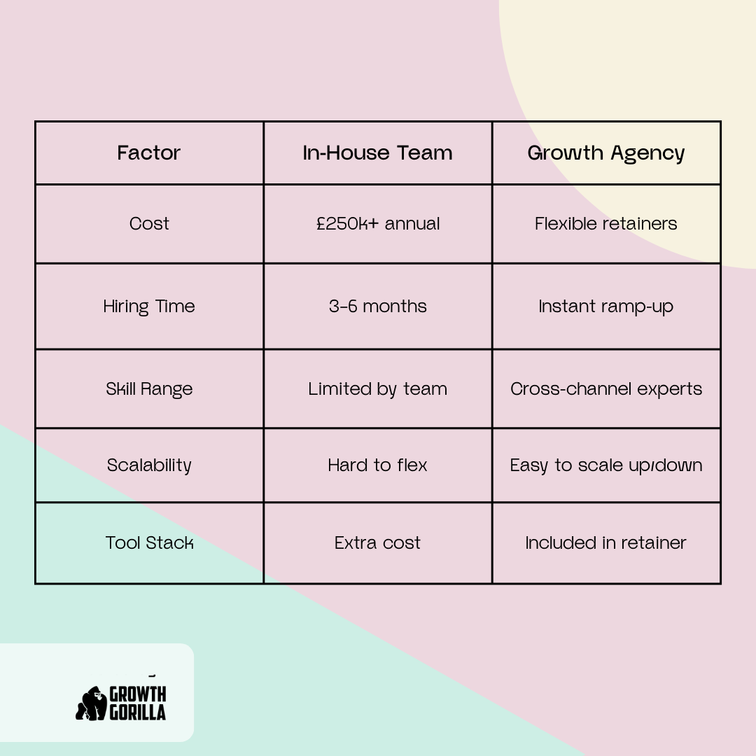 When should we move growth in-house? Once CAC stabilises and budget exceeds £100k/month.